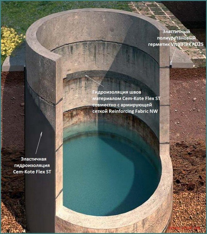 При монтаже элементов колодца для питьевой воды, либо сточных вод следует за 2–3 суток перед монтажом железобетонных колец и днища произвести гидроизоляцию внешней поверхности колодца, контактирующей с грунтом, с применением эластичной гидроизоляции Cem-Kote Flex ST в два слоя толщиной 1.6 мм;