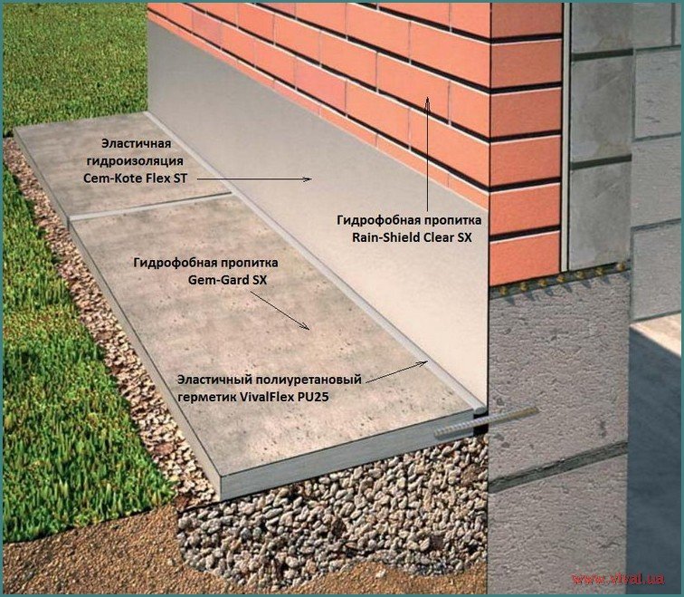 Для герметизації шва примикання вимощення до цоколя будівлі необхідно використовувати еластичний поліуретановий герметик VivalFlex PU25;